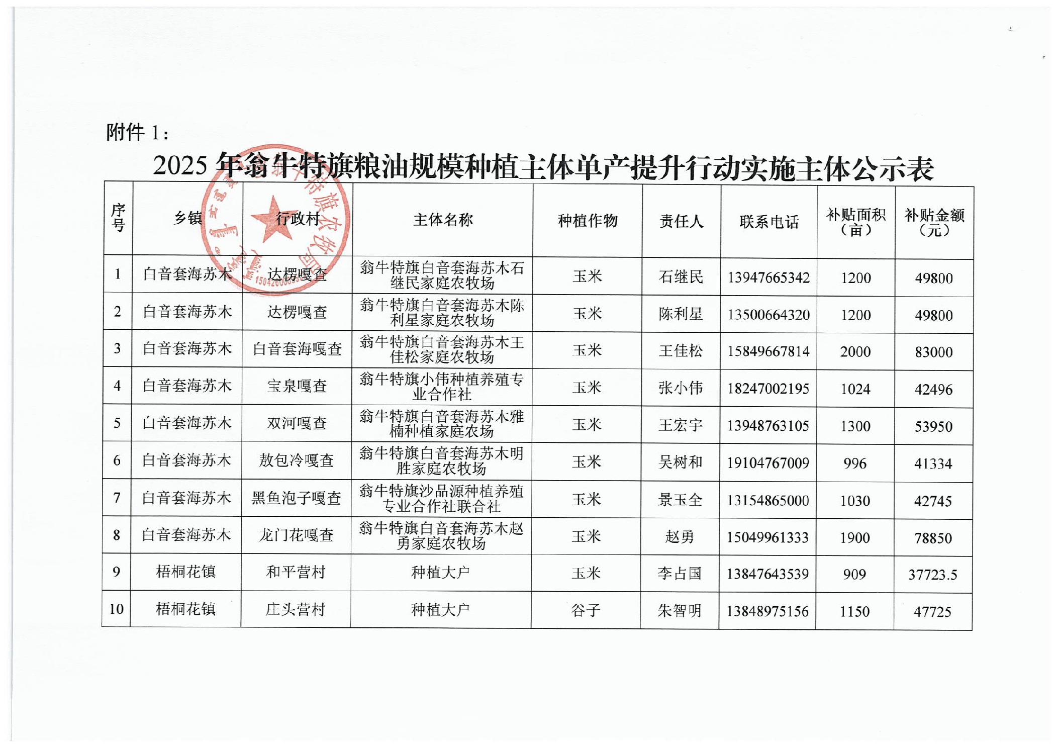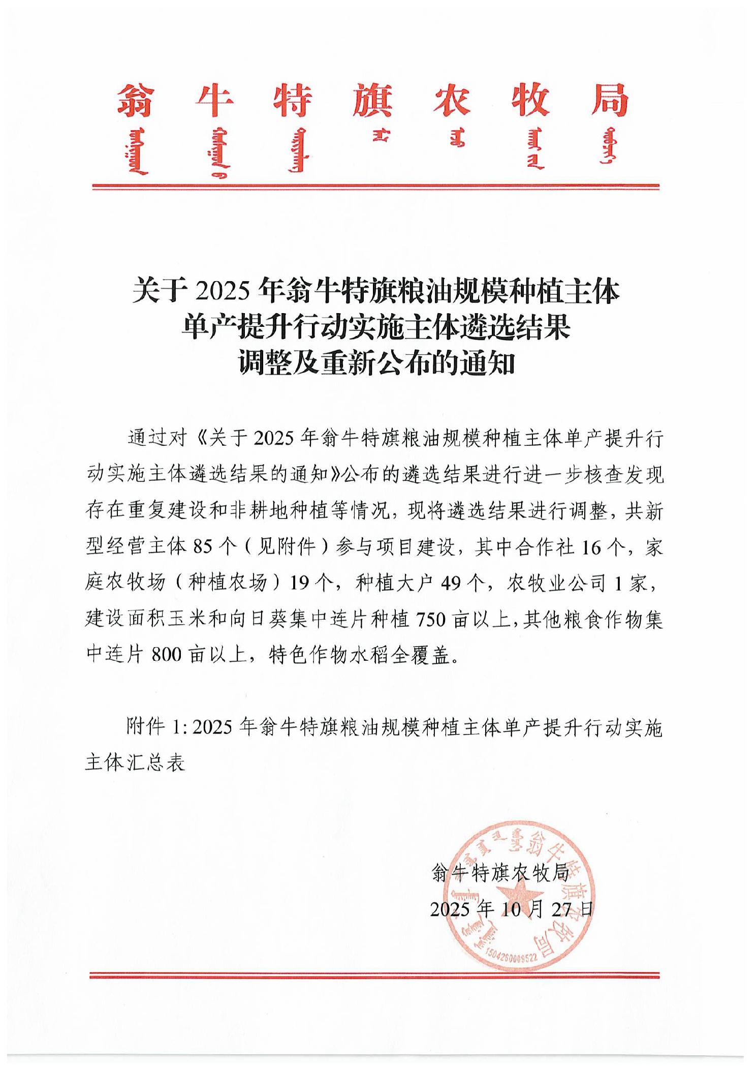 关于2025年翁牛特旗粮油规模种植主体单产提升行动实施主体遴选结果调整及重新公布的通知