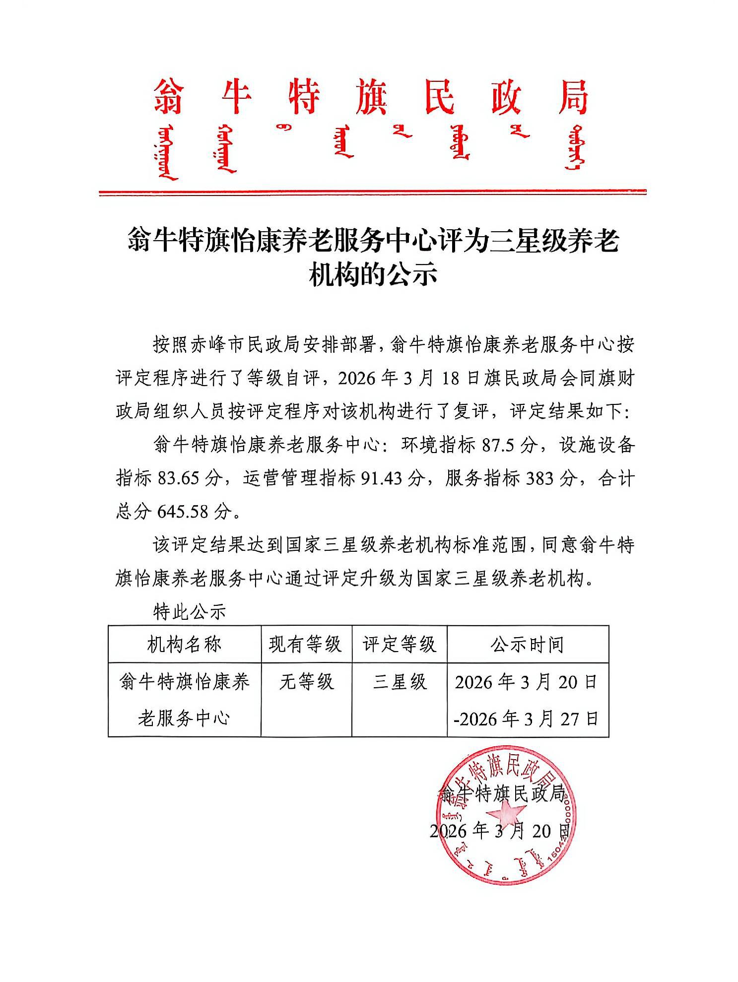 翁牛特旗怡康养老服务中心评为三星级养老机构的公示