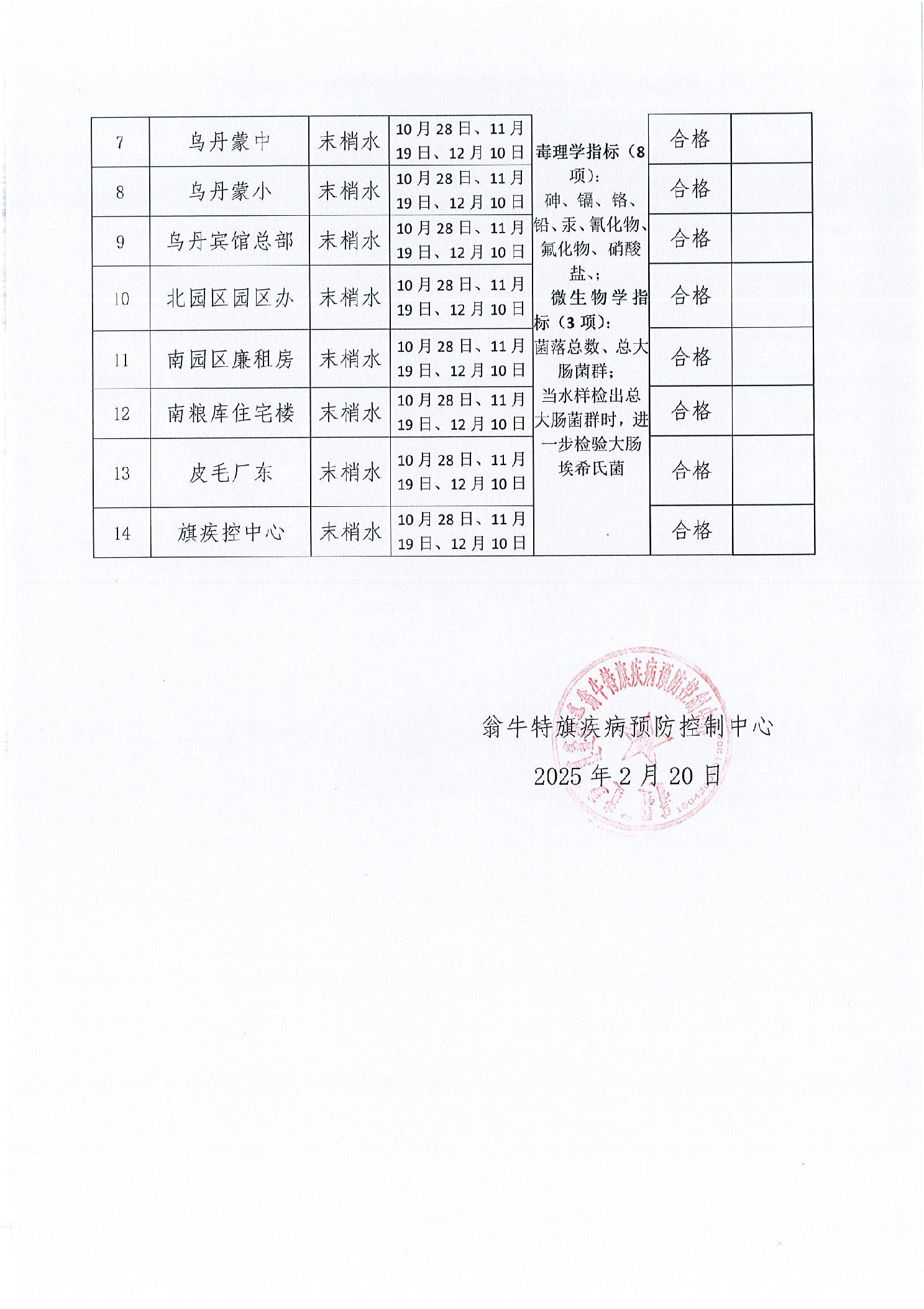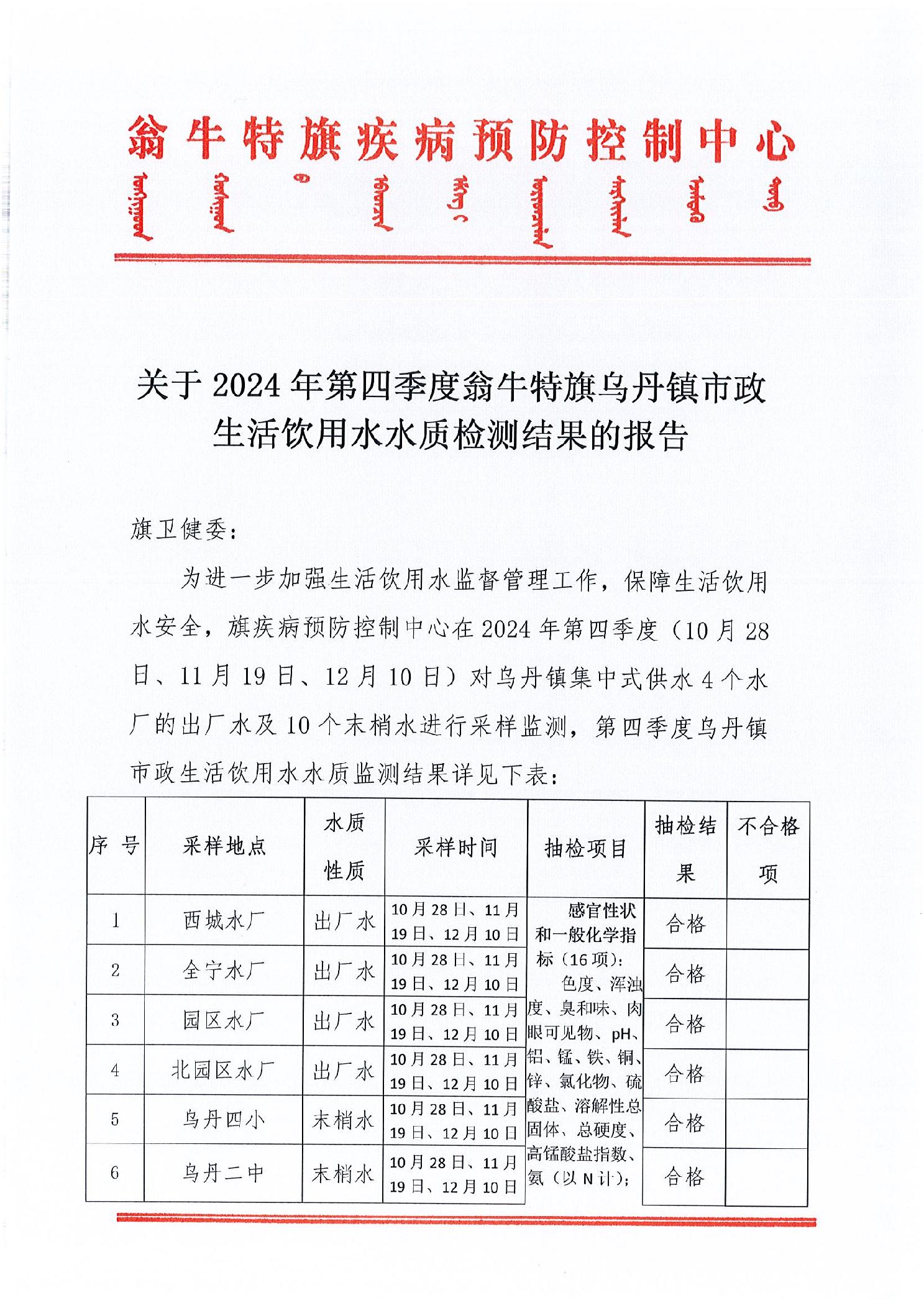 2024年第四季度翁牛特旗乌丹镇市政生活饮用水水质检测结果公示