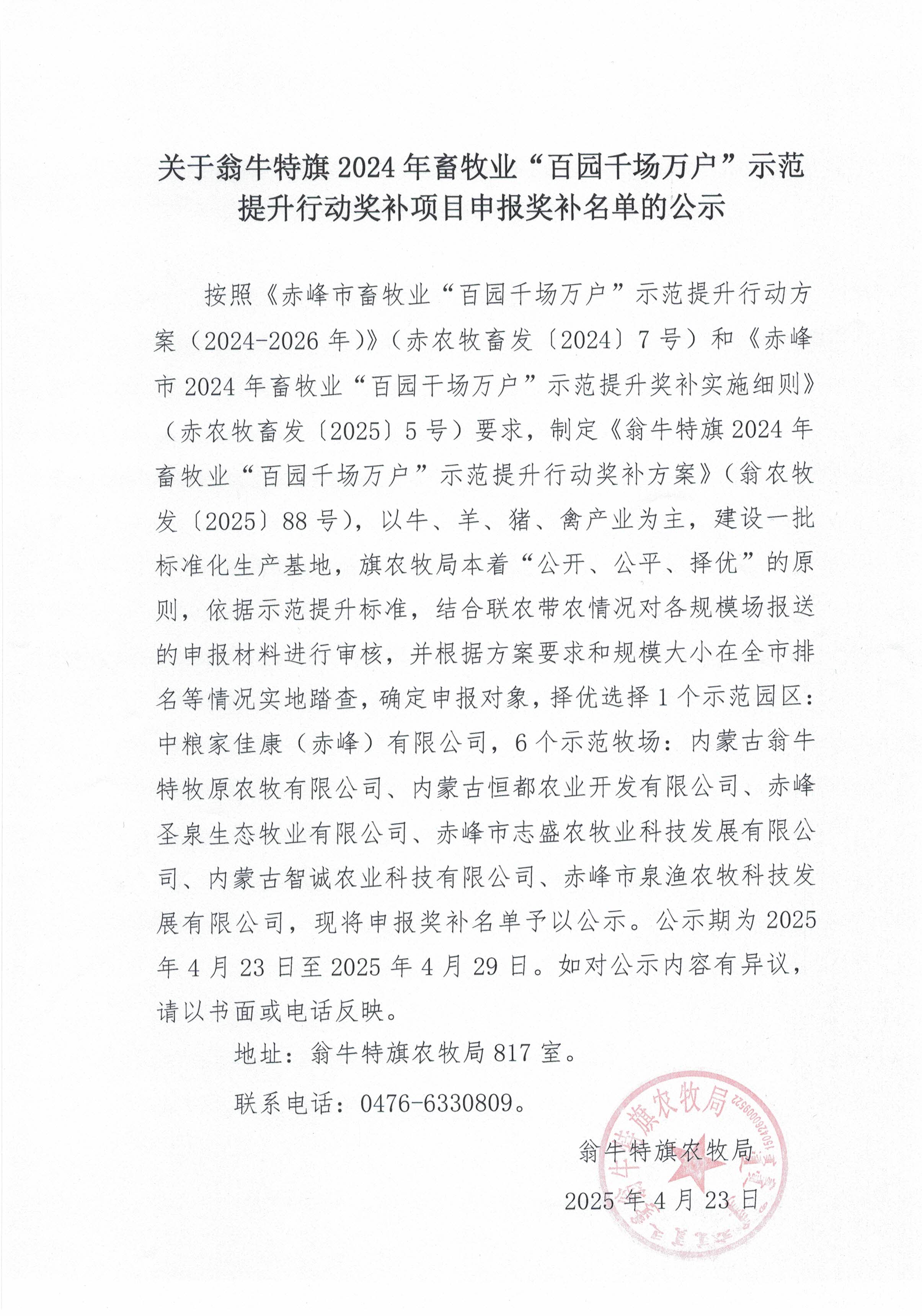 关于翁牛特旗2024年畜牧业“百园千场万户”示范提升行动奖补项目申报奖补名单的公示