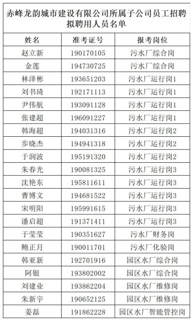 根据《赤峰龙韵城市建设有限公司所属子公司员工招聘公告》要求,经过报名、资格初审、笔试、面试资格复审、面试、体检和考察等程序环节,共有21人进入拟聘用人员范围,现按程序对拟聘用人员名单公布如下: