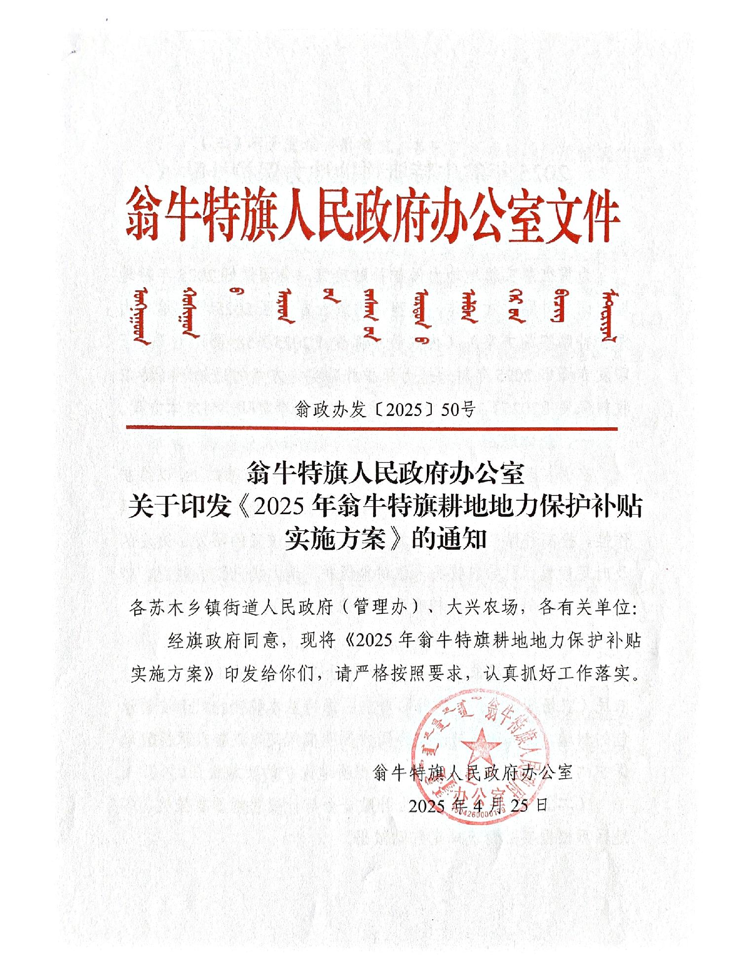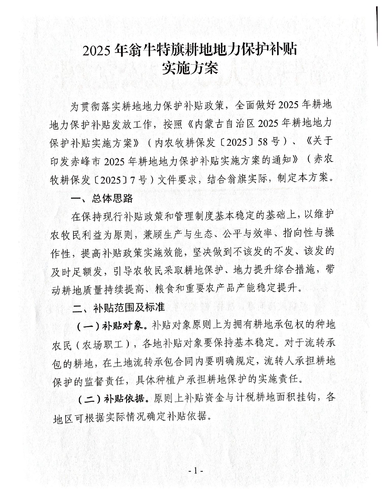 2025年翁牛特旗耕地地力保护补贴实施方案