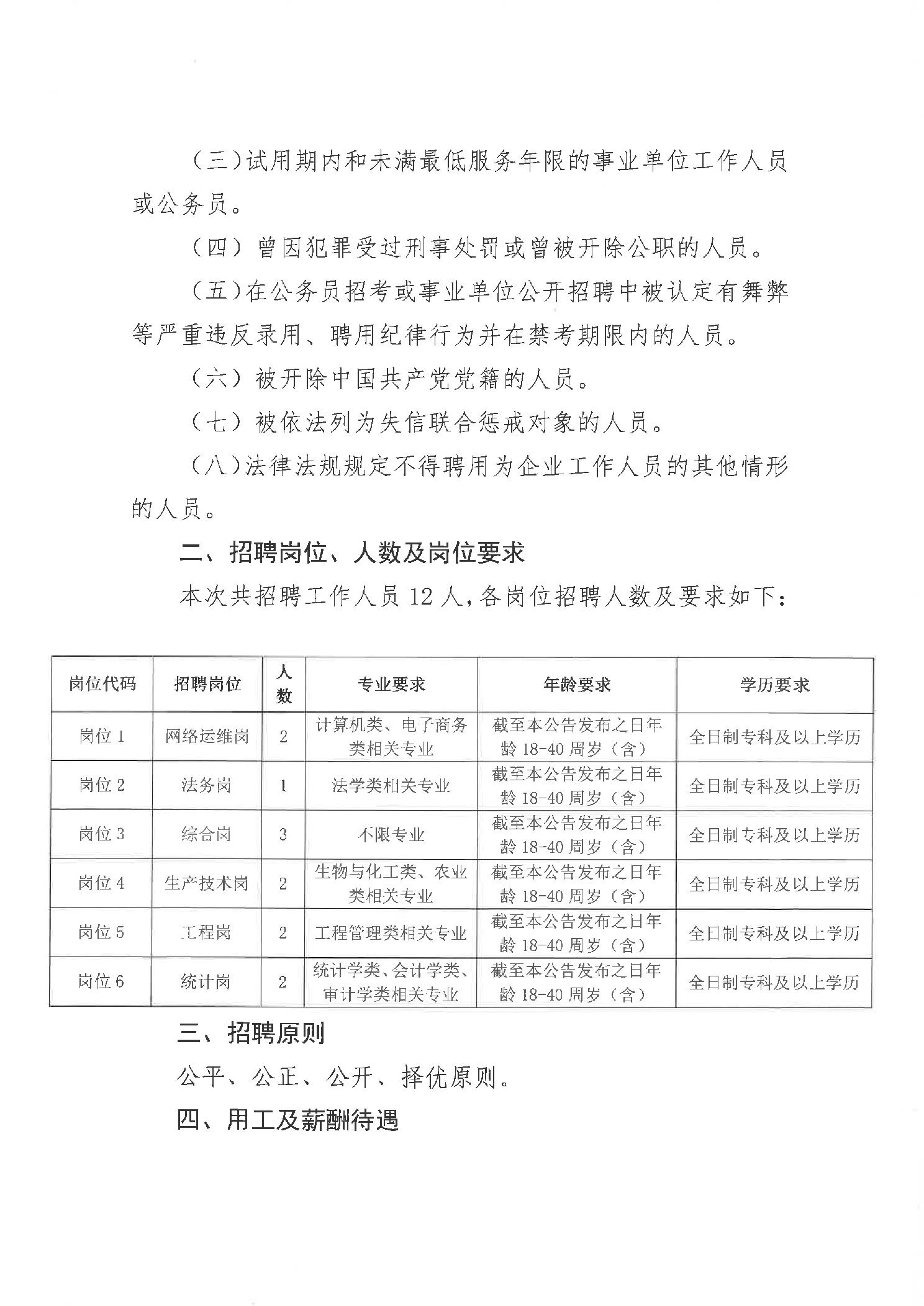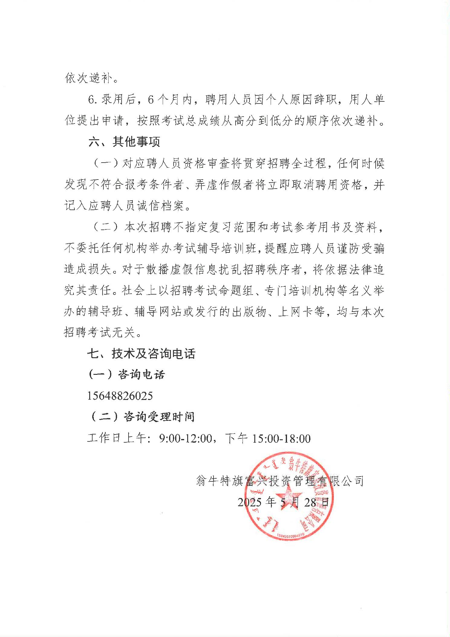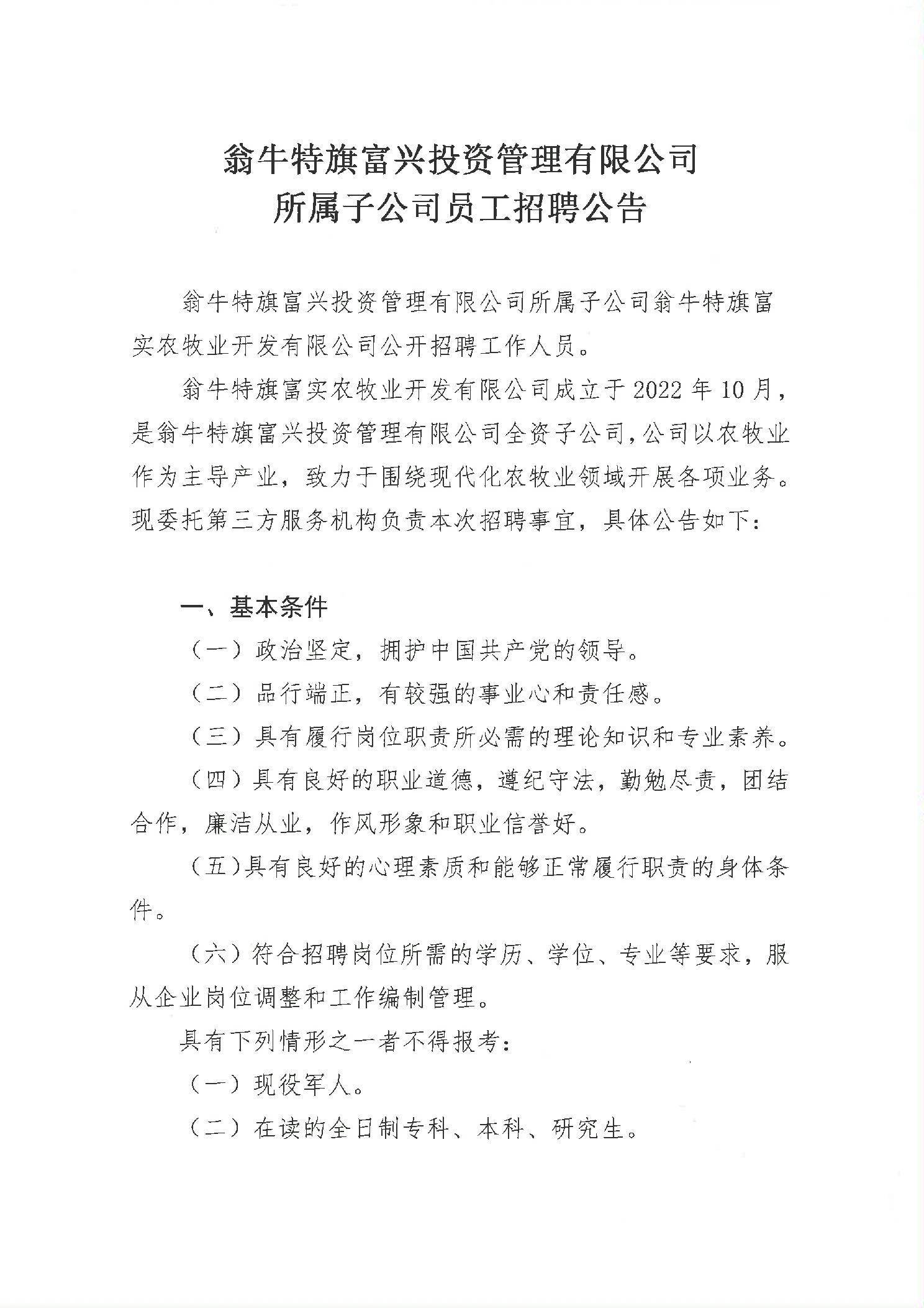 翁牛特旗富兴投资管理有限公司所属子公司员工招聘公告