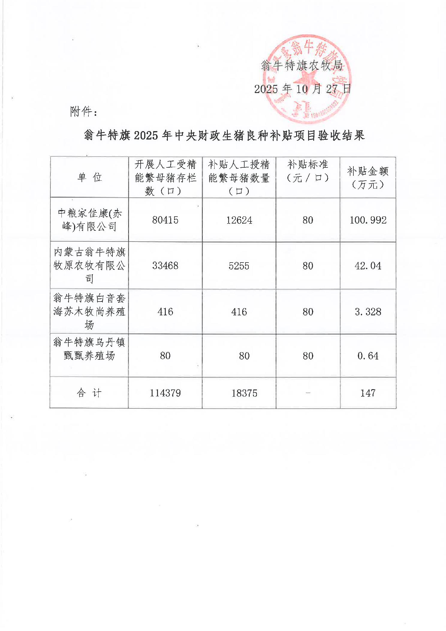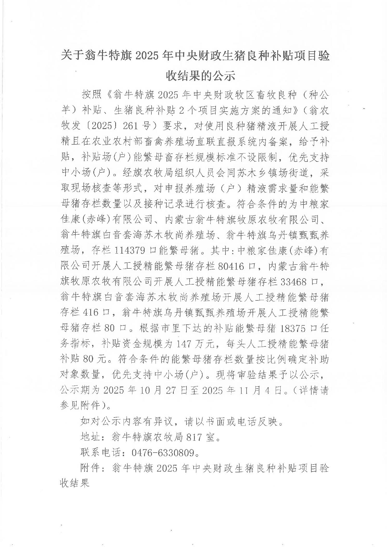 关于翁牛特旗2025年中央财政生猪良种补贴项目验收结果的公示
