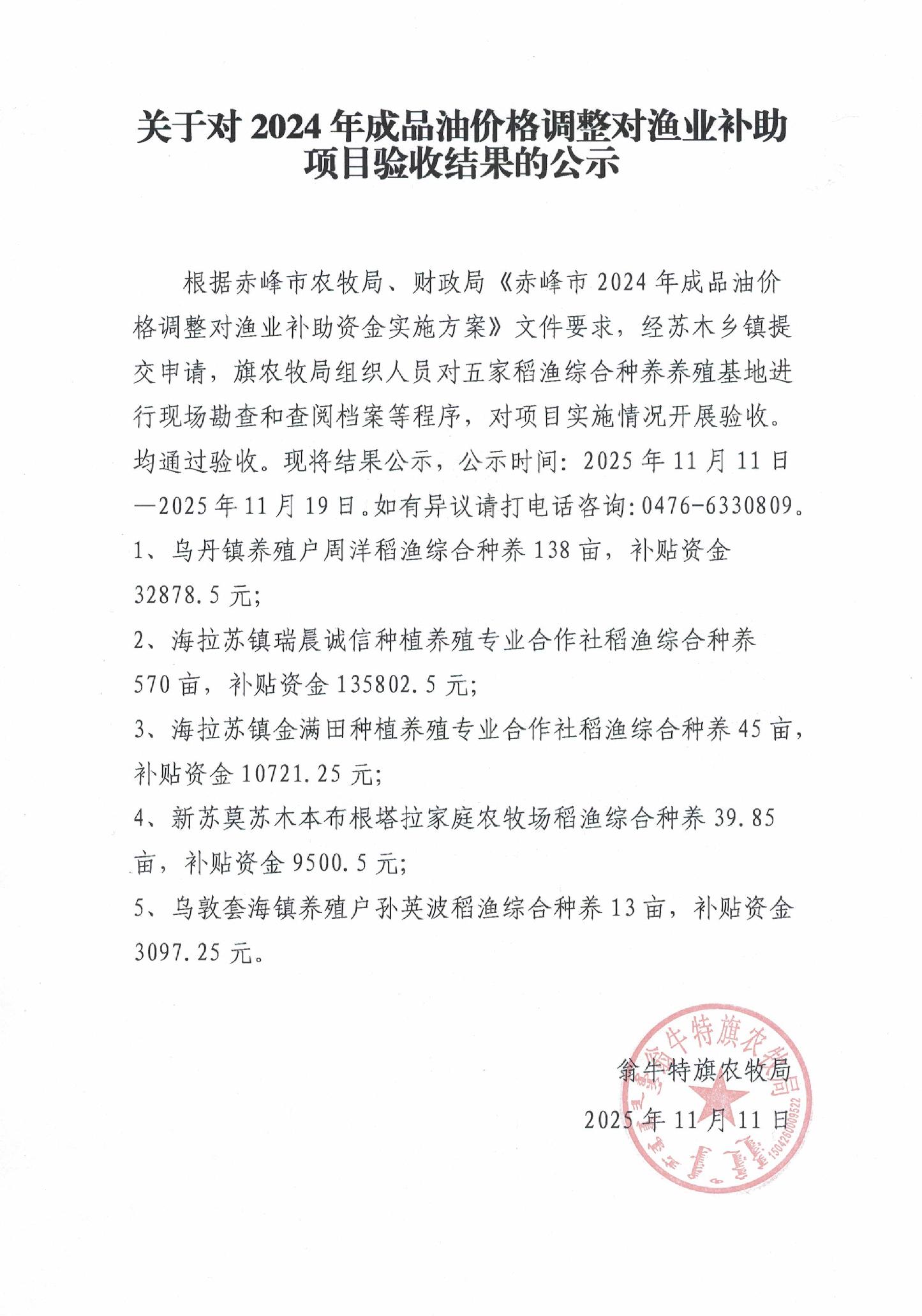 关于对2024年成品油价格调整对渔业补助项目验收结果的公示