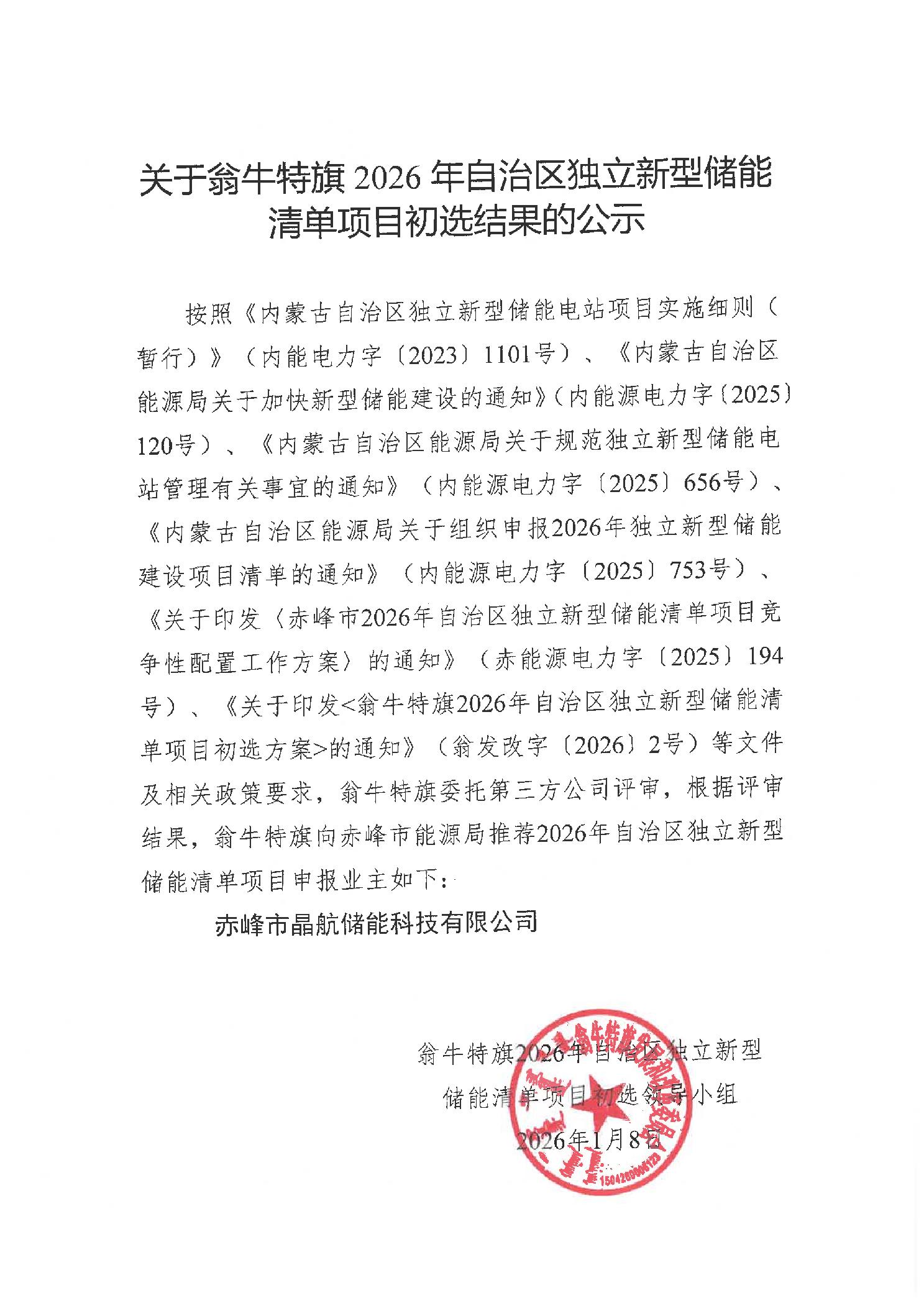 关于翁牛特旗2026年自治区独立新型储能清单项目初选结果的公示