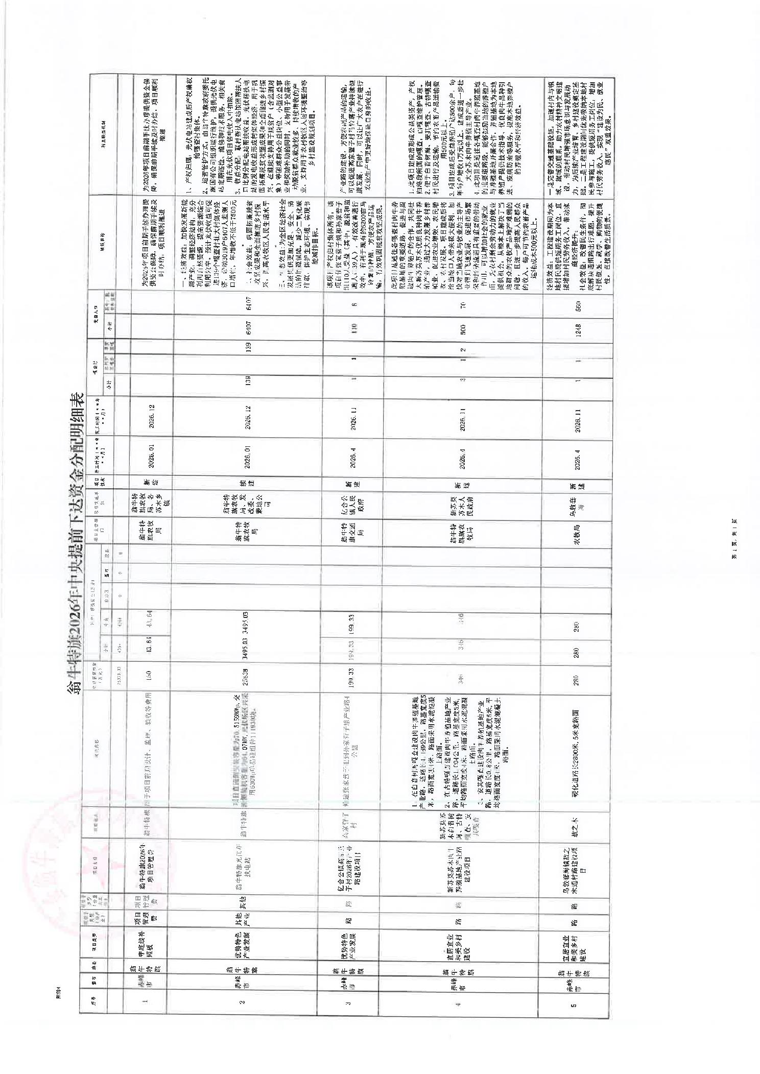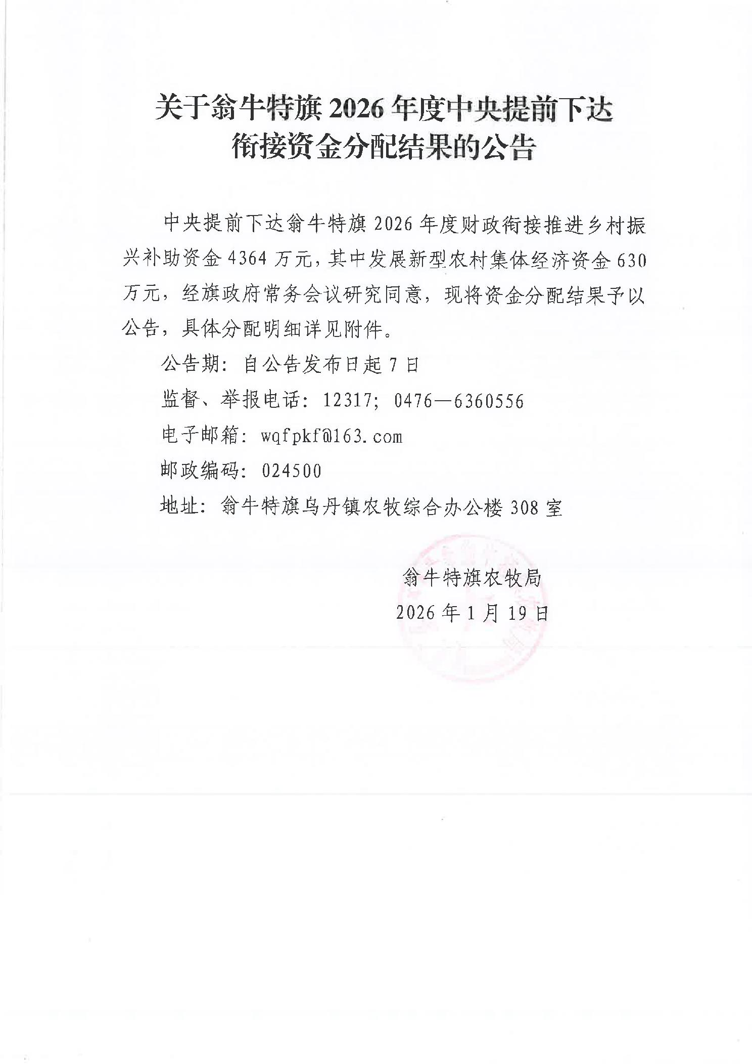 关于翁牛特旗2026年度中央提前下达衔接资金分配结果的公告