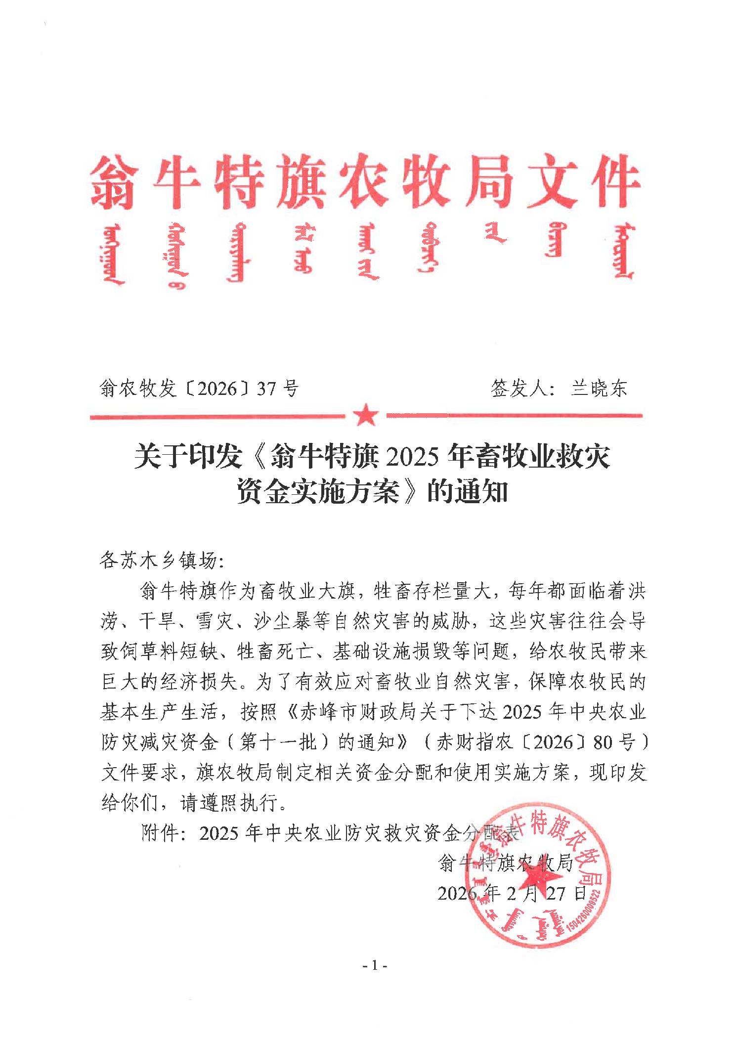 关于印发《翁牛特旗2025年畜牧业救灾资金实施方案》的通知