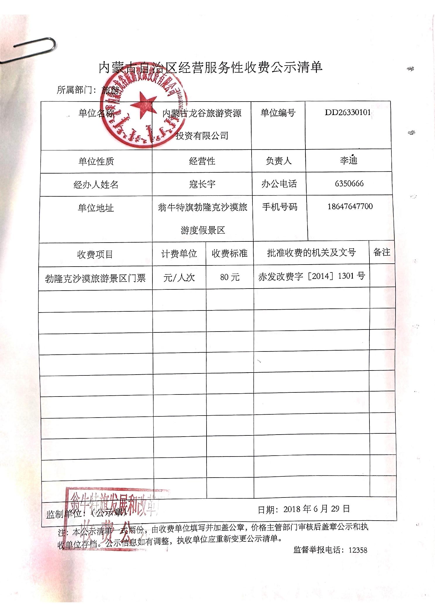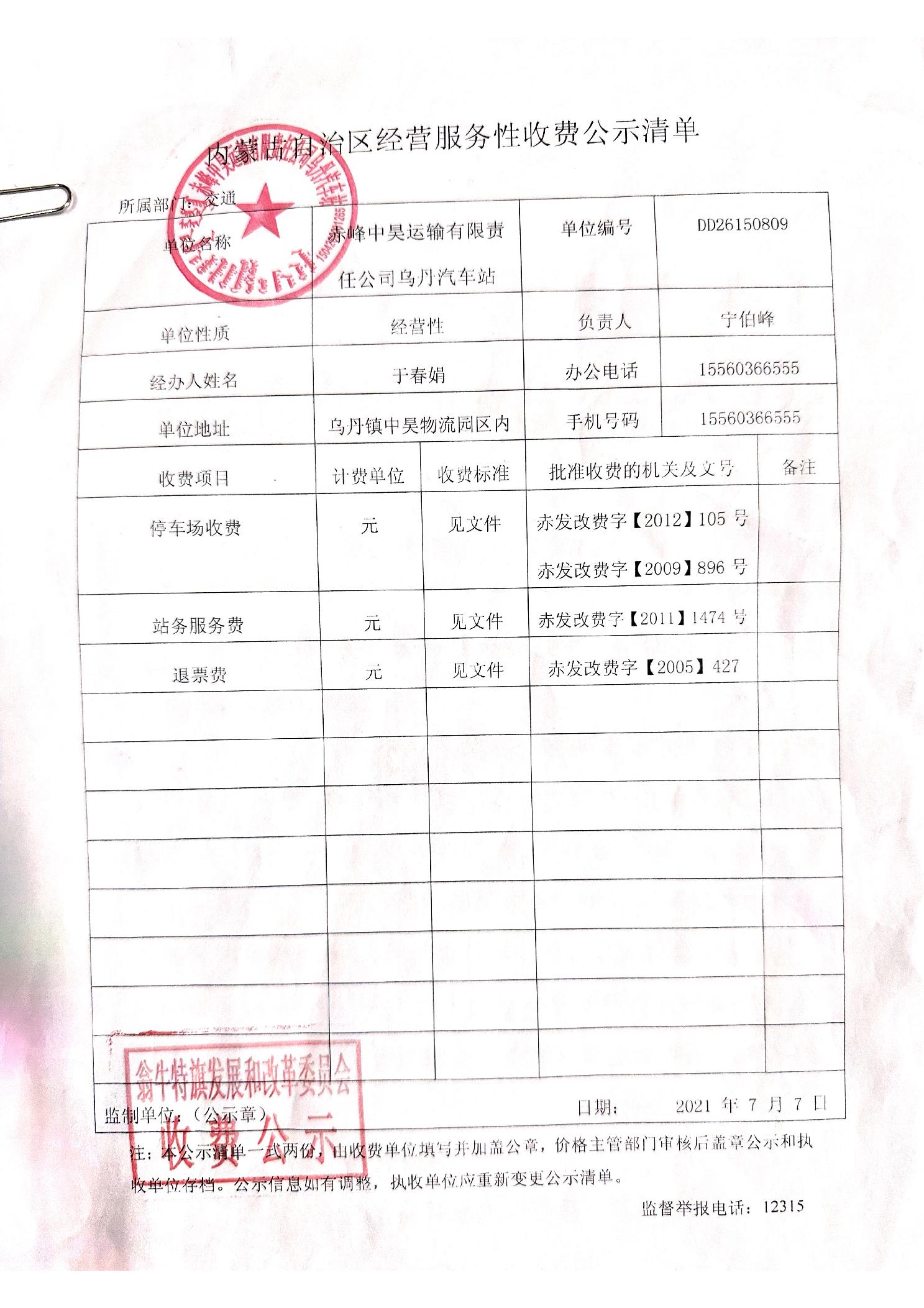 经营服务性单位收费公示清单