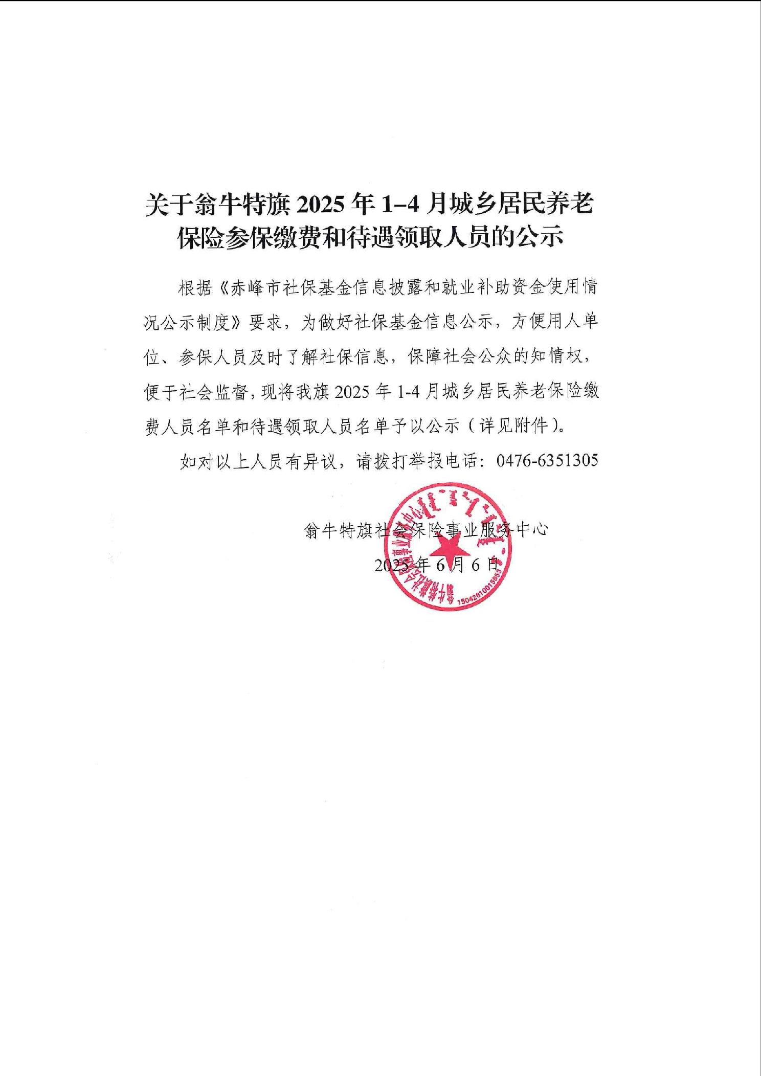 关于翁牛特旗2025年1-4月城乡居民养老保险参保缴费和待遇领取人员的公示
