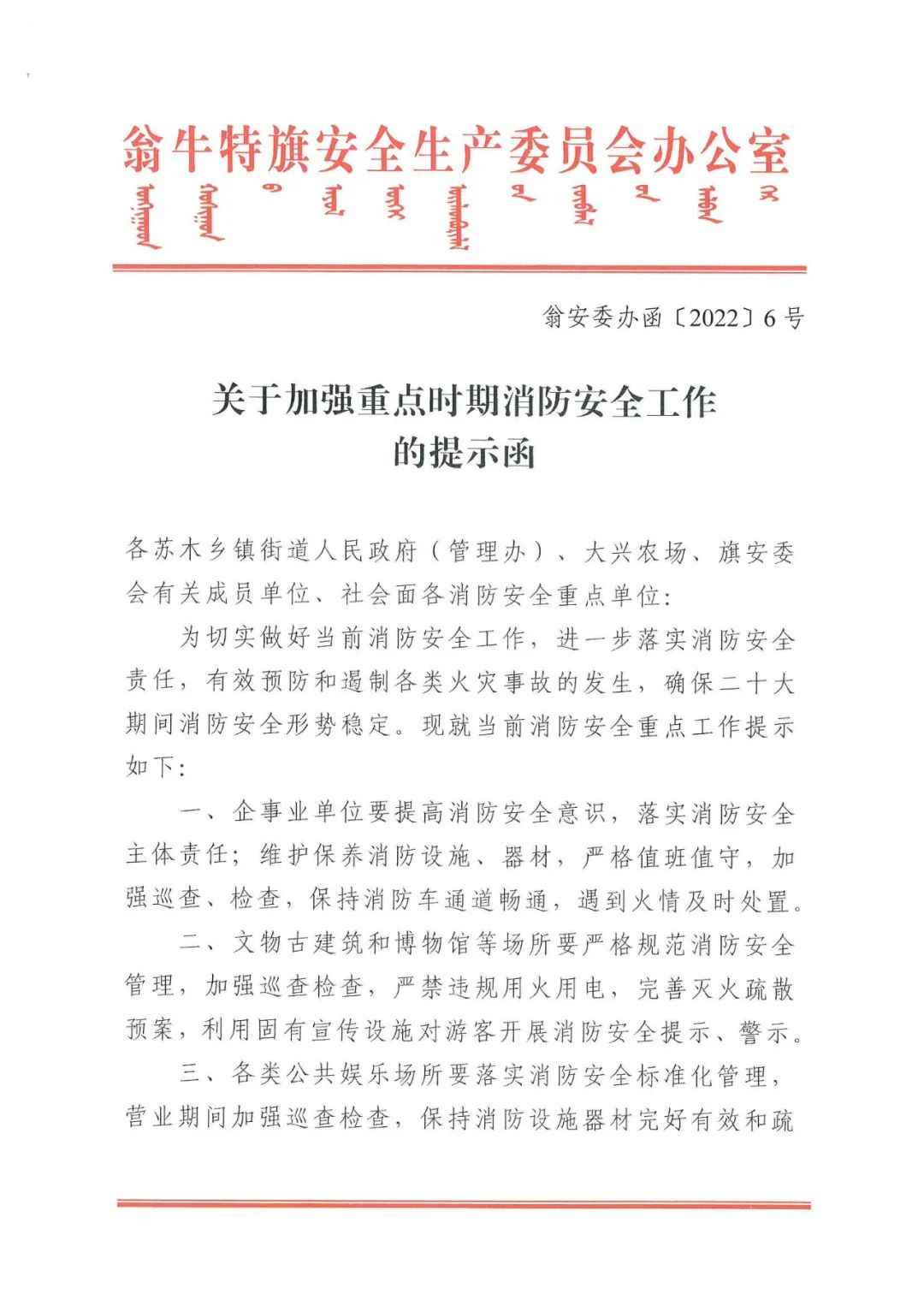 关于加强重点时期消防安全工作的提示函