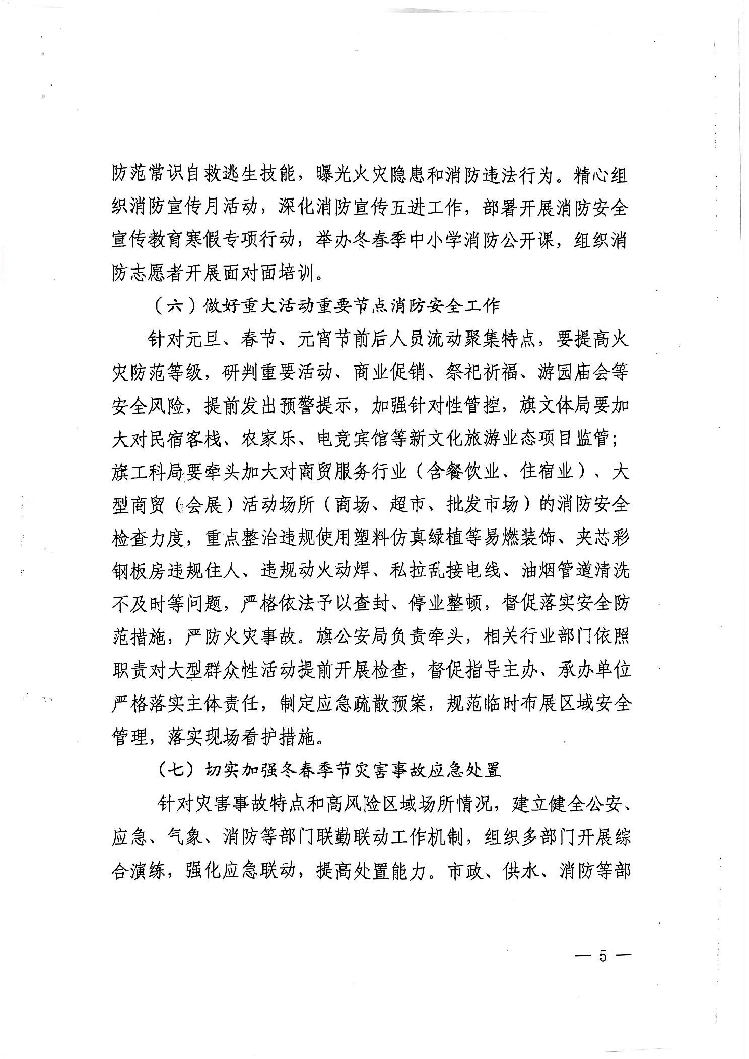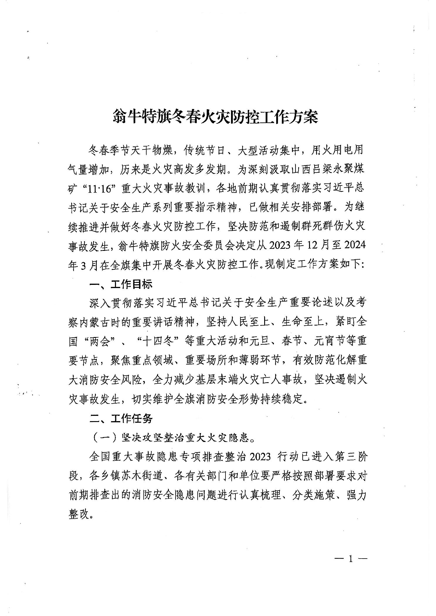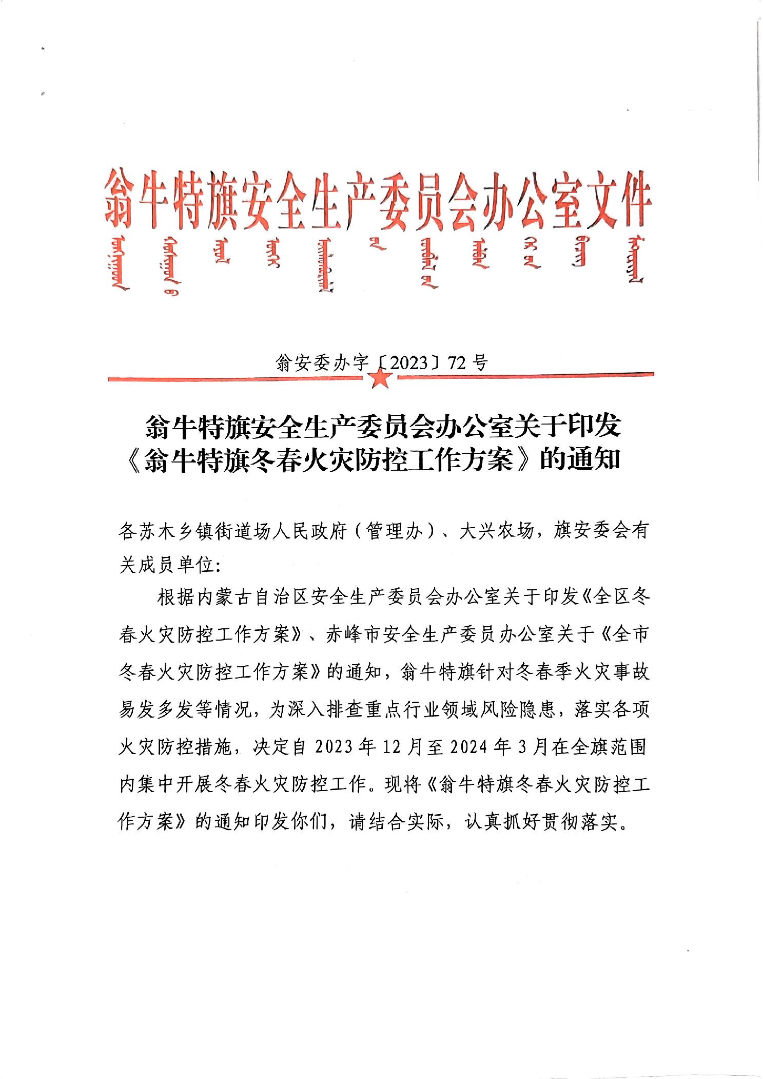 翁牛特旗安全生产委员会办公室关于印发《翁牛特旗冬春火灾防控工作方案》的通知