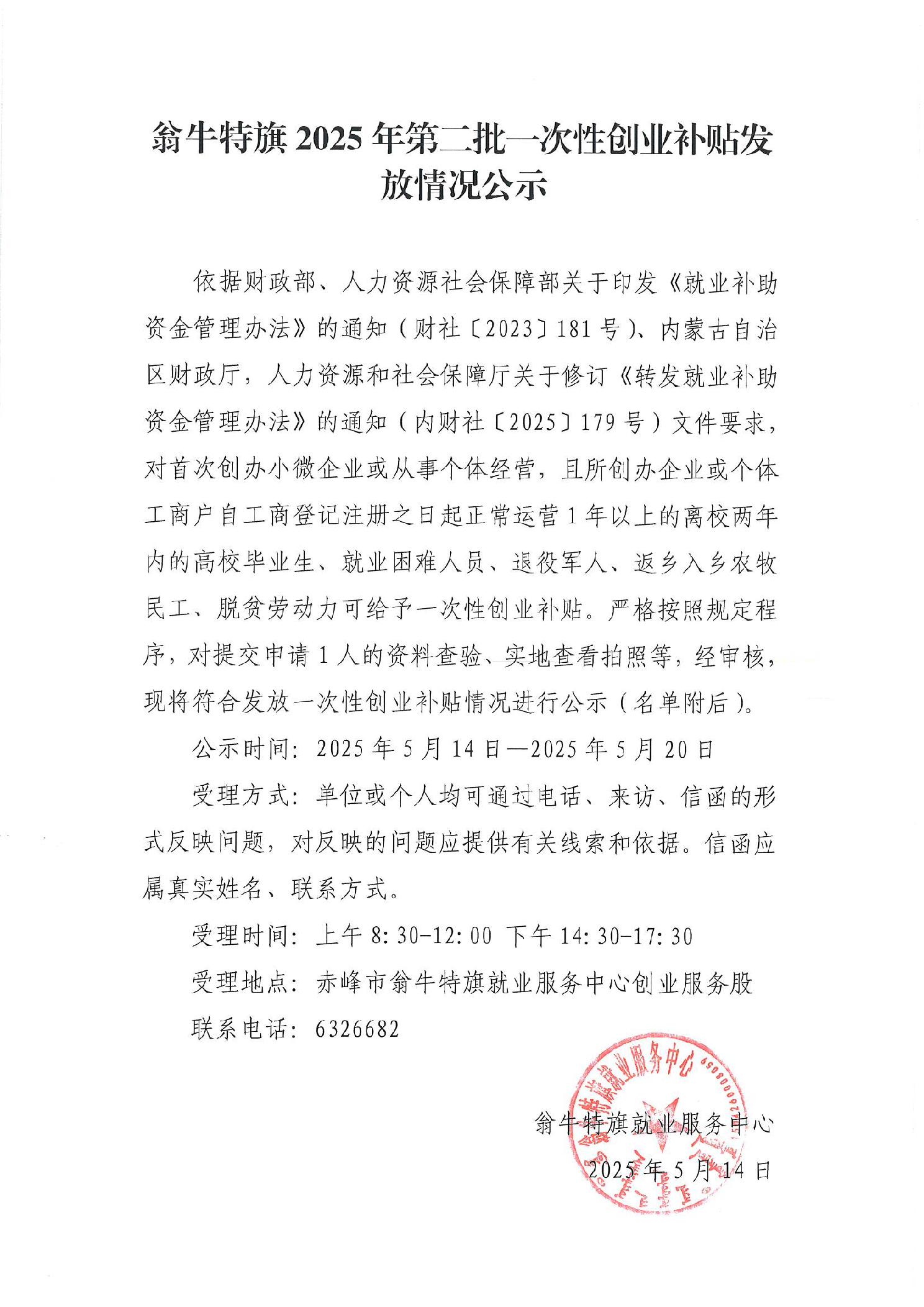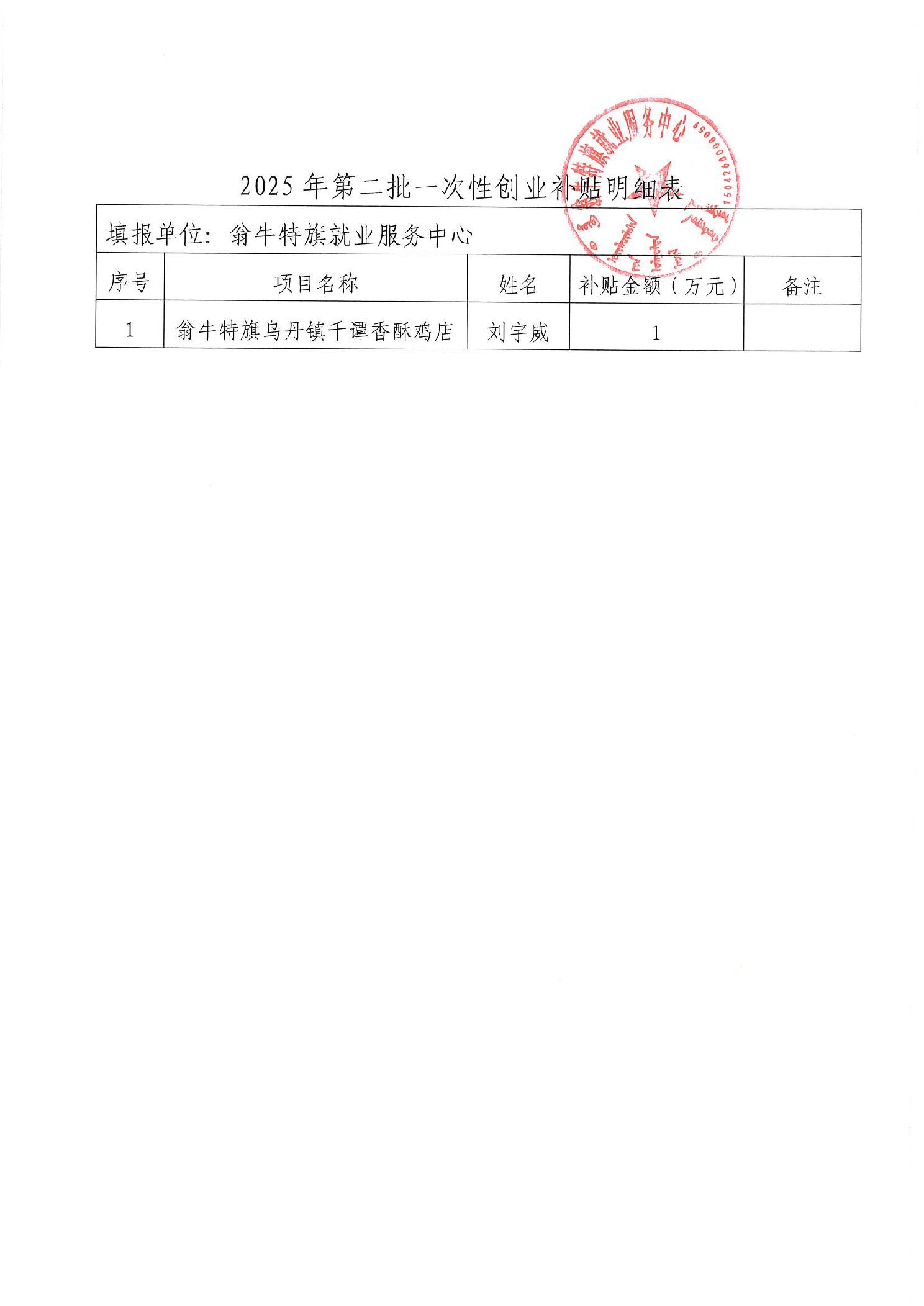 翁牛特旗2025年第二批一次性创业补贴发放情况公示