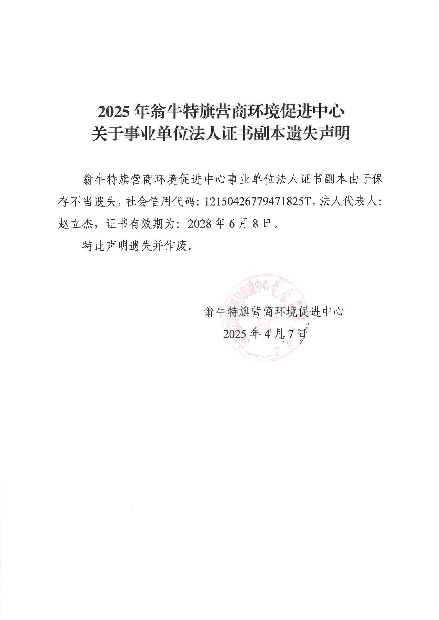 2025年翁牛特旗营商环境促进中心关于事业单位法人证书副本遗失声明
