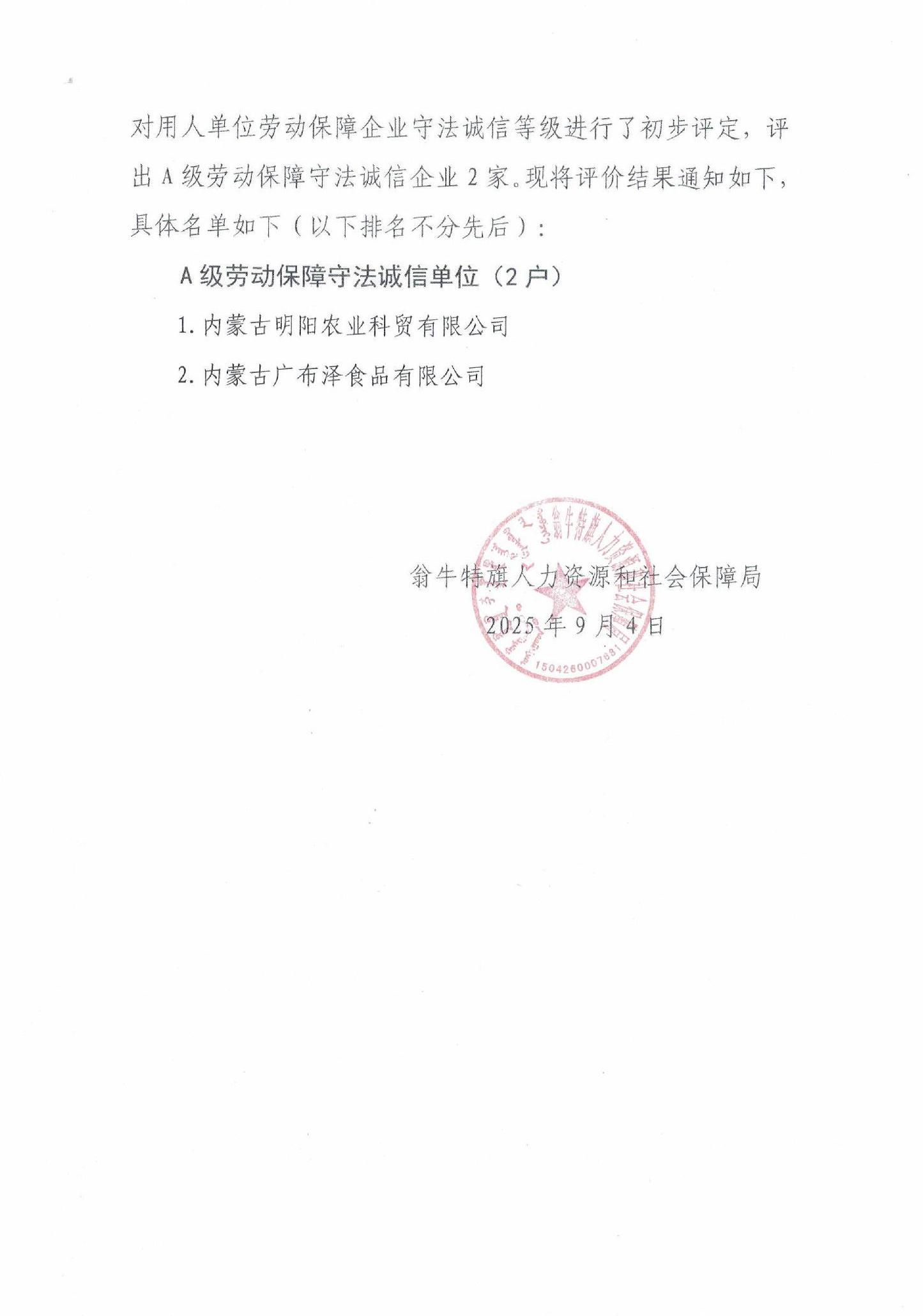 2025年翁牛特旗企业劳动保障守法诚信等级评定结果