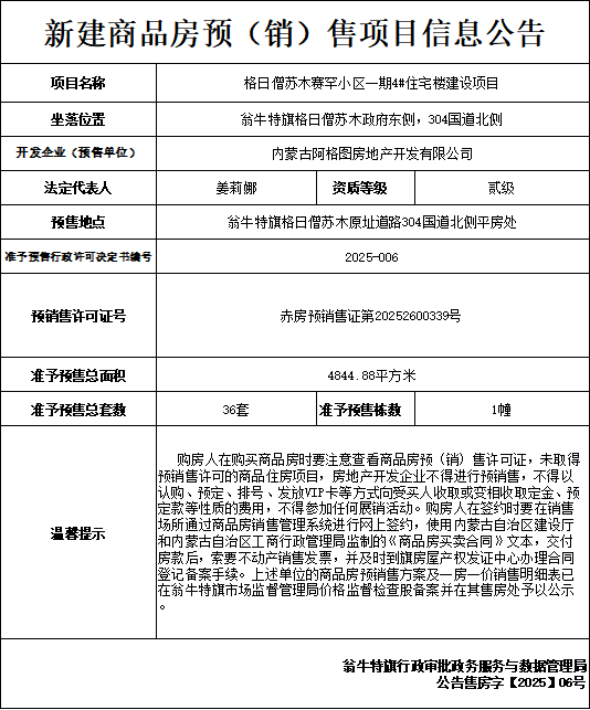 新建商品房预(销)售项目信息公告(格日僧苏木赛罕小区一期4#)