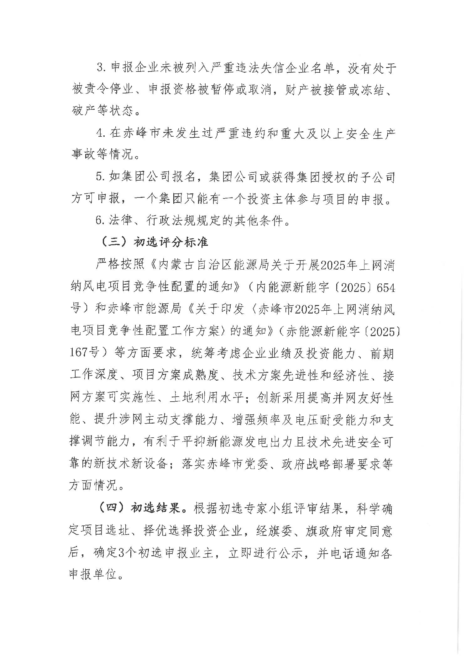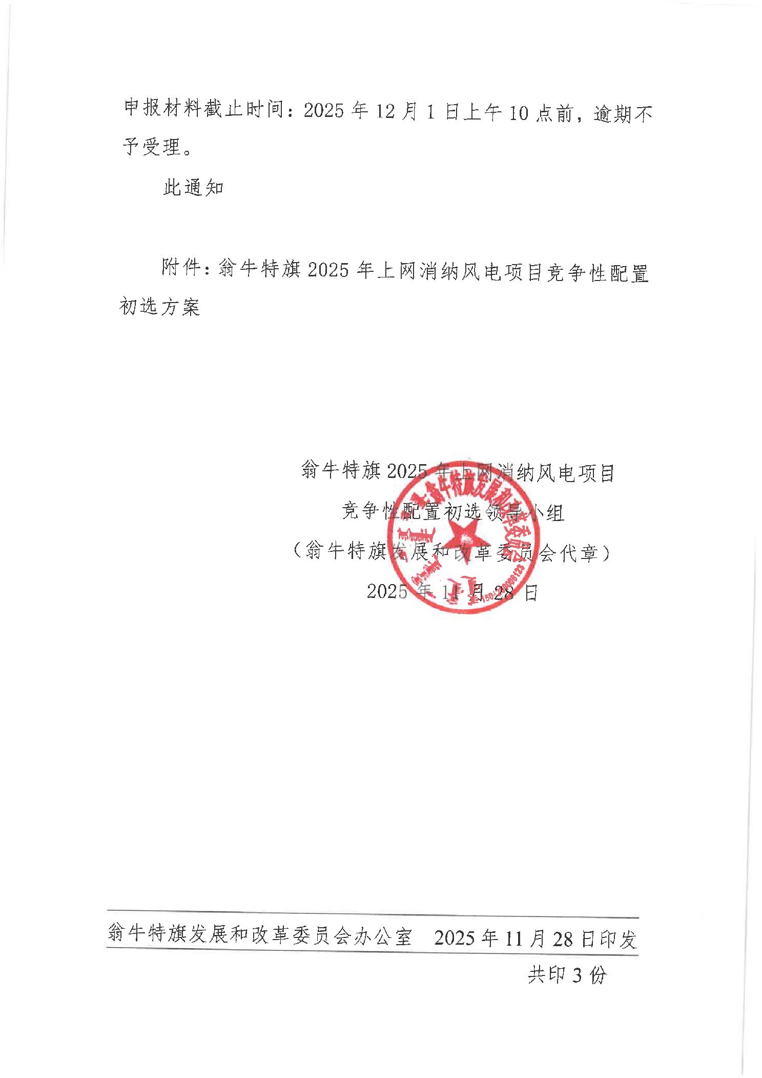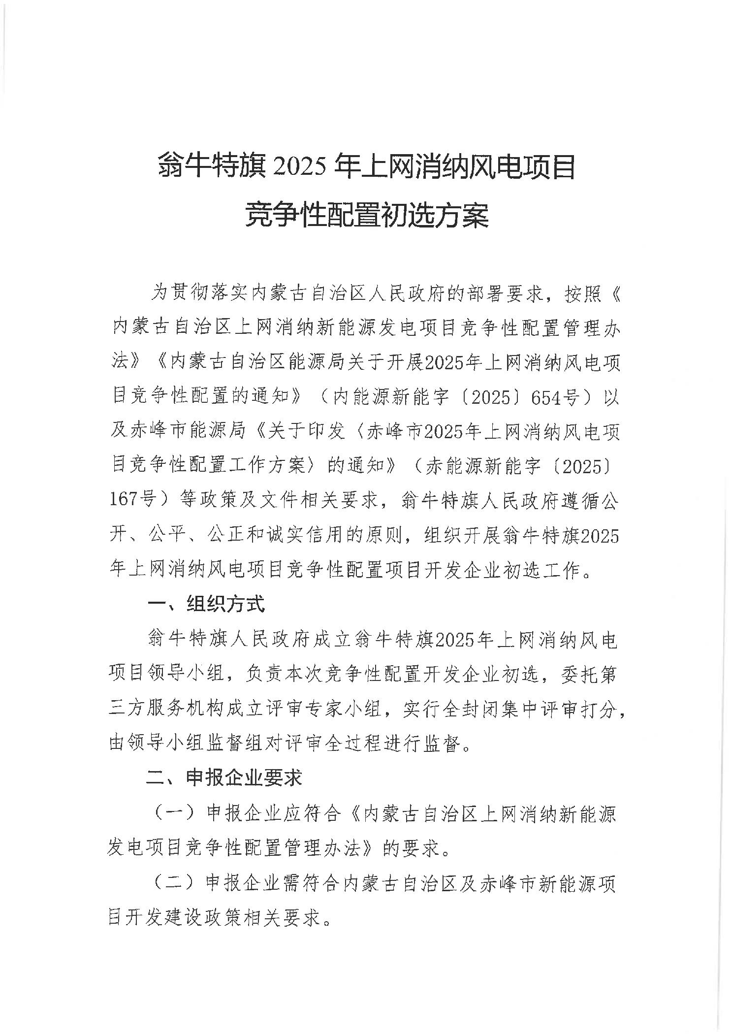 关于印发《翁牛特旗2025年上网消纳风电项目竞争性配置初选方案》的通知