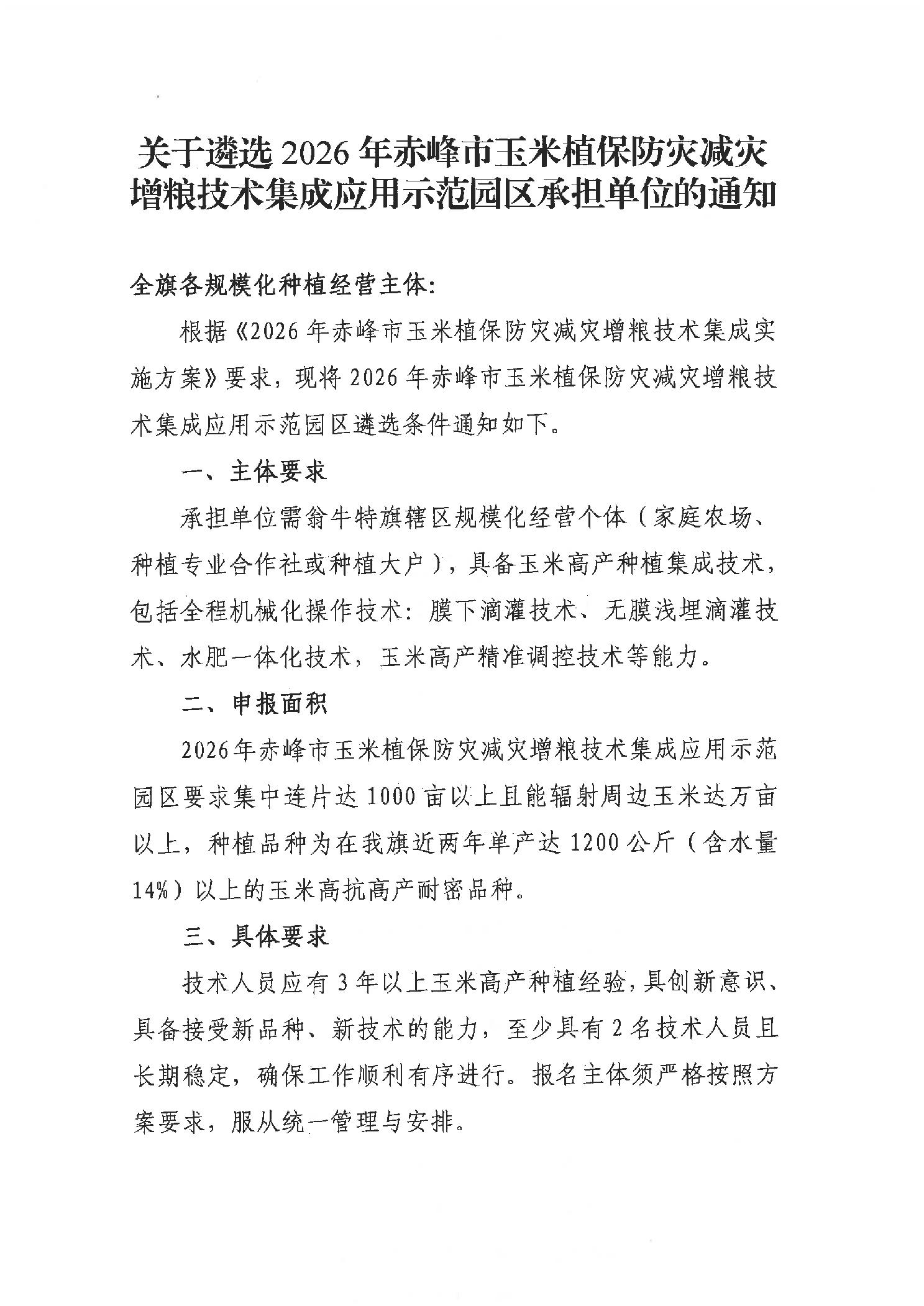 关于遴选2026年赤峰市玉米植保防灾减灾增粮技术集成应用示范园区承担单位的通知